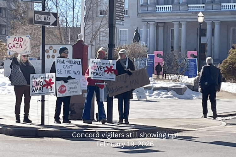 Amy Antonucci thanks organizations who sponsored our Miko Peled event at UNH, 9/16/2025.Miko Peled speaking to the audience.Miko Peled takes questions from audience.Anne Romney, NIMN, facilitated the evening’s discussion with Miko Peled. About ~150 people attended.Miko Peled speaks to the audience.Betsy Kelly speaks with Senator Jeanne Shaheen about Gaza, following the annual Portsmouth Peace Treaty bell ringing, September 2025Concord vigil, August 7,2025Keene Peace Vigil, January 2024Coalition vigil, Concord, January 2024. Photo by Sara Smith.Mother’s Day Five before arraignment. Photo by Arnie Alpert.Coalition vigil, Senator Shaheen’s office, Dover, July 2024.Coalition vigil, Warner.Karishma Manzur speaking at Nakba memorial, June 2025Medea Benjamin of Code Pink delivers a letter to Senator Maggie Hassan on behalf of NHCJPME, May 2025.Allan Gluck, Code Pink, delivers a letter to Rep. Goodlander on behalf of NHCJPME, May 2025.Coalition members participating in the VFP-led fast for Gaza, May-Jun 2025.Veteran for Peace, Jesse Gillis, speaks at No War with Iran Rally, Concord, NH, June 2025.NH Peace Action, Board Director, Amy Antonucci, speaking at No War with Iran rally, Concord, NH, June 2025.No War with Iran rally, Concord, NH, June 2025.